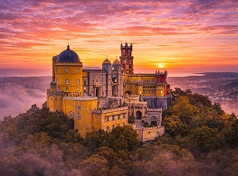 A fairytale palace perched atop a hill in Sintra, this colorful and eclectic structure blends Gothic, Renaissance, and Manueline styles, offering breathtaking views of the surrounding landscapes.