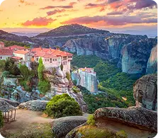 A breathtaking complex of monasteries perched atop towering rock formations, offering a surreal and spiritual landscape.